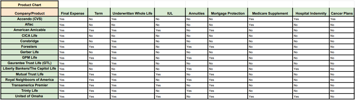 Life & Health Insurance Products for Every Clients Needs Annuities Cancer Plans Final Expense Hospital Indemnity Medicare Supplement Mortgage Protection Term Life Universal Life Whole Life Product Chart